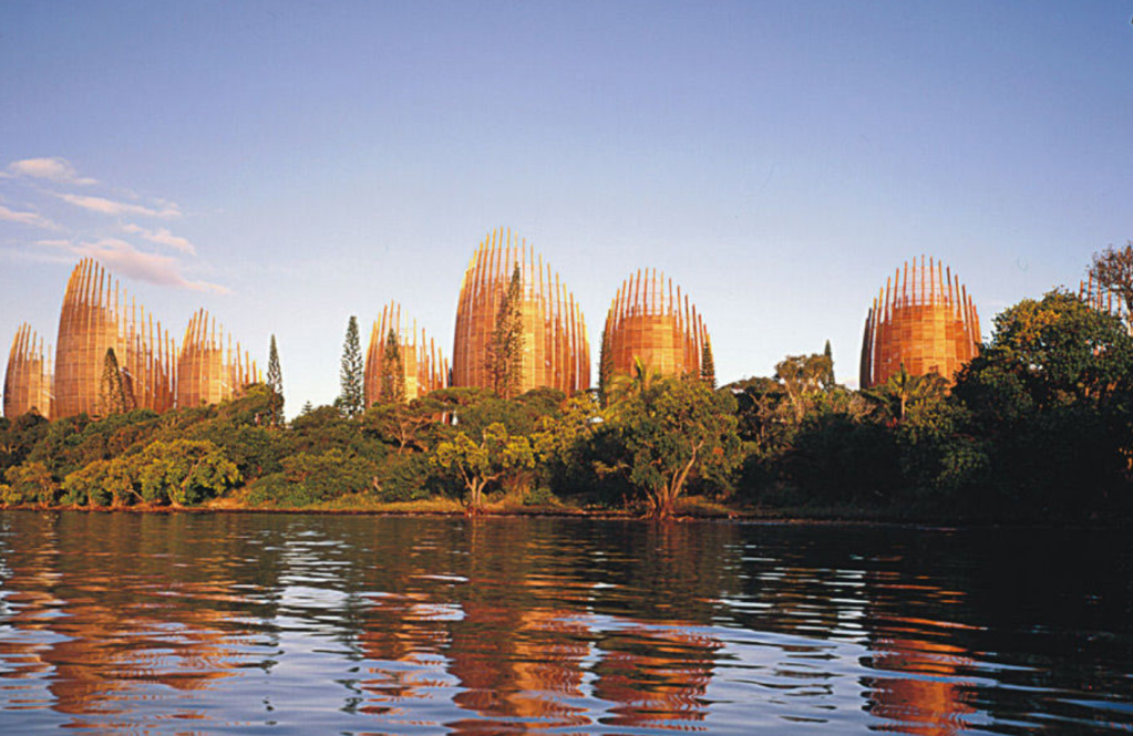 Renzo Piano’s work called Jean-Marie Tjibaou Cultural Centre. The center consists of 10 huts with three different sizes, from 20 to 28m in height and interconnected by a footpath. Renzo Piano used local materials such as stainless steel, glass, nature wood, and laminated wood. Also, he used some sustainable materials called iroko, it is a kind of wood which was imported from Africa.